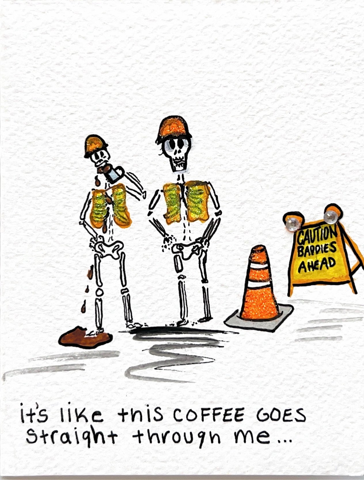 Handmade greeting card with some humor! Original designs Hand painted with water color, 3D details, and a hilarious catch phrase to go with it! All cards are handmade and subject to small imperfect corky details! If you’d like a personal detail or drawing message shop or instagram direct message us! Add a Blue Collar Babes Candles to make a perfect gift!